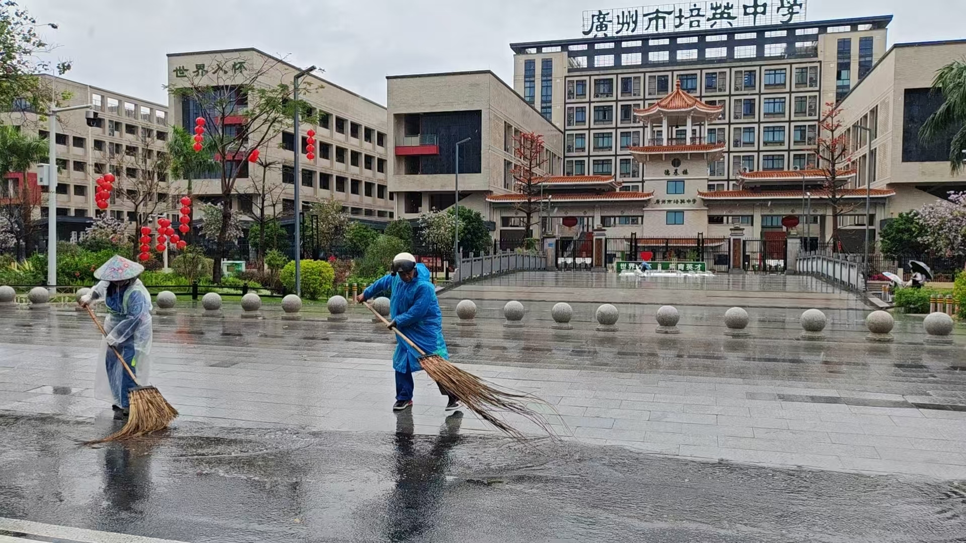 在广州市培英中学(云城校区)周边,环卫工人身着反光衣,手持扫帚,分片包干、协同作战,重点对校园周边200米范围内的积水、淤泥、落叶及杂物进行清理,加快积水消退,清掏堵塞雨水口的杂物,确保排水畅通。截至目前,共出动环卫工人870余人次、作业车辆32辆次,清理校园周边积水点位56处、淤泥及杂物1.2吨,疏通堵塞雨水口72处,完成38所学校周边路面保洁,全面清除出行安全隐患。