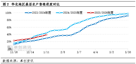 截至2026年1月9日,2025/2026年度华北地区基层农户售粮进度整体先快后慢,因玉米集中收割期遇持续阴雨天气,收割期基层农户整体售粮积极性较高,2025年11月初华北多数地区基层农户玉米售粮进度快于上一年度同期。但随着玉米收割结束及玉米价格上涨,基层农户售粮积极性减弱,售粮进度放缓。截至2026年1月8日,华北地区平均售粮进度为39%,较上一年度同期慢5个百分点。2025年11月-12月基层农户售粮量有限,玉米新增供应有限,玉米价格供应略偏紧,为玉米价格提供支撑。
